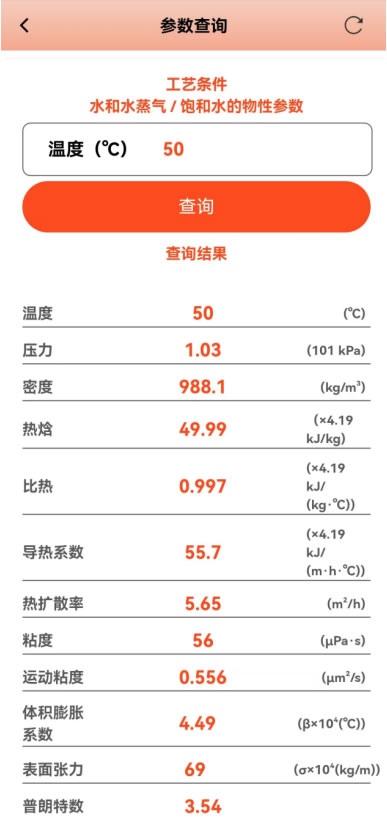 參數查詢:提供便捷的硫酸數據參數查詢功能,方便用戶快速查閱硫酸的相關參數,如二氧化硫的水溶液密度、在硫酸中的溶解度;發煙硫酸不同濃度時的密度、不同溫度下的濃度、硫的飽和蒸汽密度、水和水蒸氣的物性參數等等。