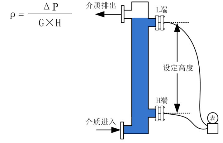 設定壓力變送器的兩膜片間距固定,將壓力變送器傳感器安裝在H端的水平位置下方;完成儀表調零后,灌入介質,使其完全淹沒L端膜片,測得壓力值,即可計算得出介質的密度。