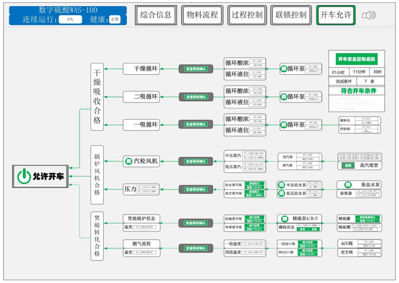 裝置在開車過程中往往是最忙碌的,經過檢修或者緊急處理后,操作人員需要對裝置的當前狀態進行多項人工確認,由于時間緊迫和高強度的操作會使操作人員在開車過程中身心疲憊,難以集中,開車過程中的事故通常是在這種情況下發生的。美國ASM(異常狀態管理協會)研究,化工裝置引起異常狀態的原因有36%是設備故障引起,有22%是工藝引起,有42%是操作人員失誤引起。因此一套人機友好的開車安全自動控制系統就顯得尤為重要,能指導操作人員自動完成開車安全的自動檢查,出現故障能協助操作人員完成故障排除,在開車前使裝置各關鍵條件100%滿足要求,有效防止人員失誤引起的開車事故發生,圖2、圖3為DSC-100硫酸裝置開車安全自動控制系統在80萬噸硫磺制酸裝置上的控制畫面。