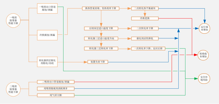 二吸塔除霧器帶酸造成下游管道、設備腐蝕和泄漏,上述泄漏需要停車處理,相應地硫酸裝置開車率也會下降。【1】