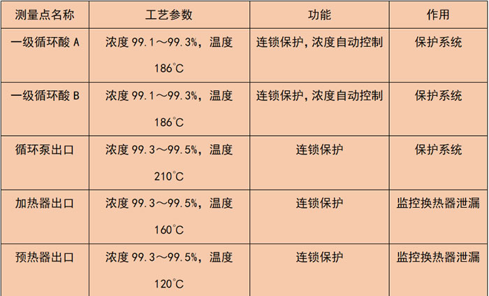 表1 余熱回收裝置高溫酸濃儀安裝位置