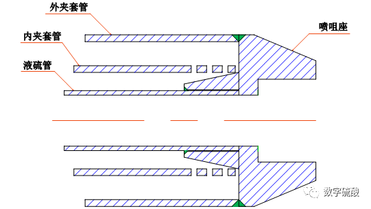 經過分析,導致硫黃噴槍彎曲的主要原因是槍身受熱應力分布不均。高效硫黃噴槍保溫夾套在設計時,對槍身受熱應力變化做了分析。裝置運行時燃燒火焰受氣流漩渦影響,火焰會對硫黃噴槍前部加熱,而前部區域是受火焰炙烤的,因此噴槍前部會有熱應力膨脹。為了使噴槍熱應力膨脹一致,需要在槍身內部使保溫蒸汽分布均勻。因此我們在槍身夾套流通面積上,設置了4道保溫蒸汽均勻分布環(見上左圖),用均勻分布環強制混合每段蒸汽溫度,使進入下一段的蒸汽溫度一致。從而達到噴槍槍身溫度一致,避免熱應力膨脹使槍身。