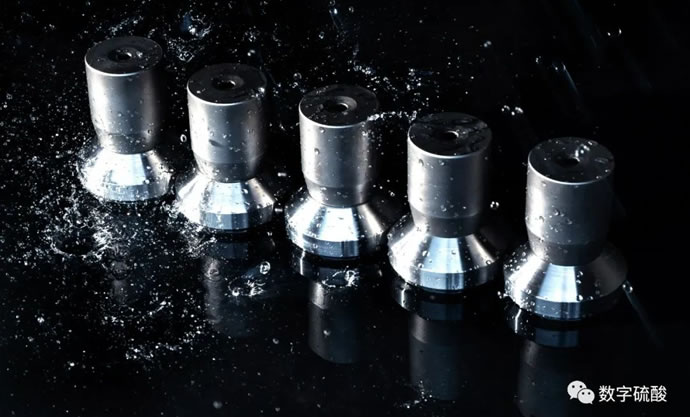 高效噴咀采用固定式機械強制螺旋霧化和拉瓦爾噴管增速技術。液體硫黃從液硫管進入噴咀,經過一級拉瓦爾噴管加速,進入機械強制螺旋霧化芯,形成高速離心旋轉體,再次進入二級拉瓦爾噴管,再次被加速,此時噴出的液硫獲得高速離心力和加速度,使其形成小于20um的霧化硫黃顆粒。在拉瓦爾噴管技術的作用下液硫霧化壓力降低至0.4MPa,達到高效霧化效果。