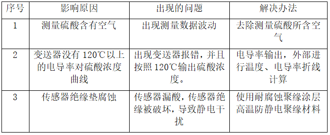 具體原因說明:由于稀釋器采用壓縮空氣霧化脫鹽水增強(qiáng)擾動(dòng)的技術(shù),導(dǎo)致從稀釋器出來的循環(huán)硫酸含有空氣介質(zhì)。而現(xiàn)采用的電導(dǎo)率傳感器不能準(zhǔn)確測(cè)量含有空氣介質(zhì)的硫酸濃度。當(dāng)含有空氣介質(zhì)的硫酸通過電導(dǎo)率傳感器時(shí),由于空氣不導(dǎo)電,此時(shí)測(cè)量的電導(dǎo)率非常低,并且不穩(wěn)定。由于硫酸濃度越高電導(dǎo)率越低,測(cè)量值則比實(shí)際偏大且波動(dòng)大,故無法準(zhǔn)確測(cè)量。